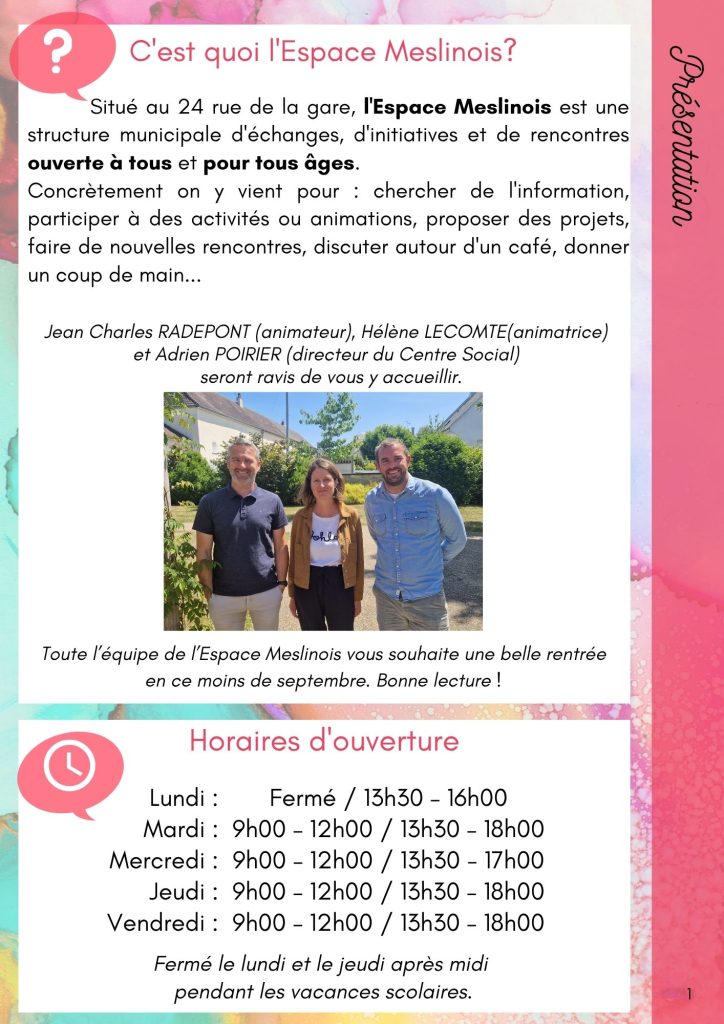 Situé au 24 rue de la gare l’Espace Meslinois est une structure municipale d’échanges, d’initiatives et de rencontres ouverte à tous et pour tout âge. On y vient pour :